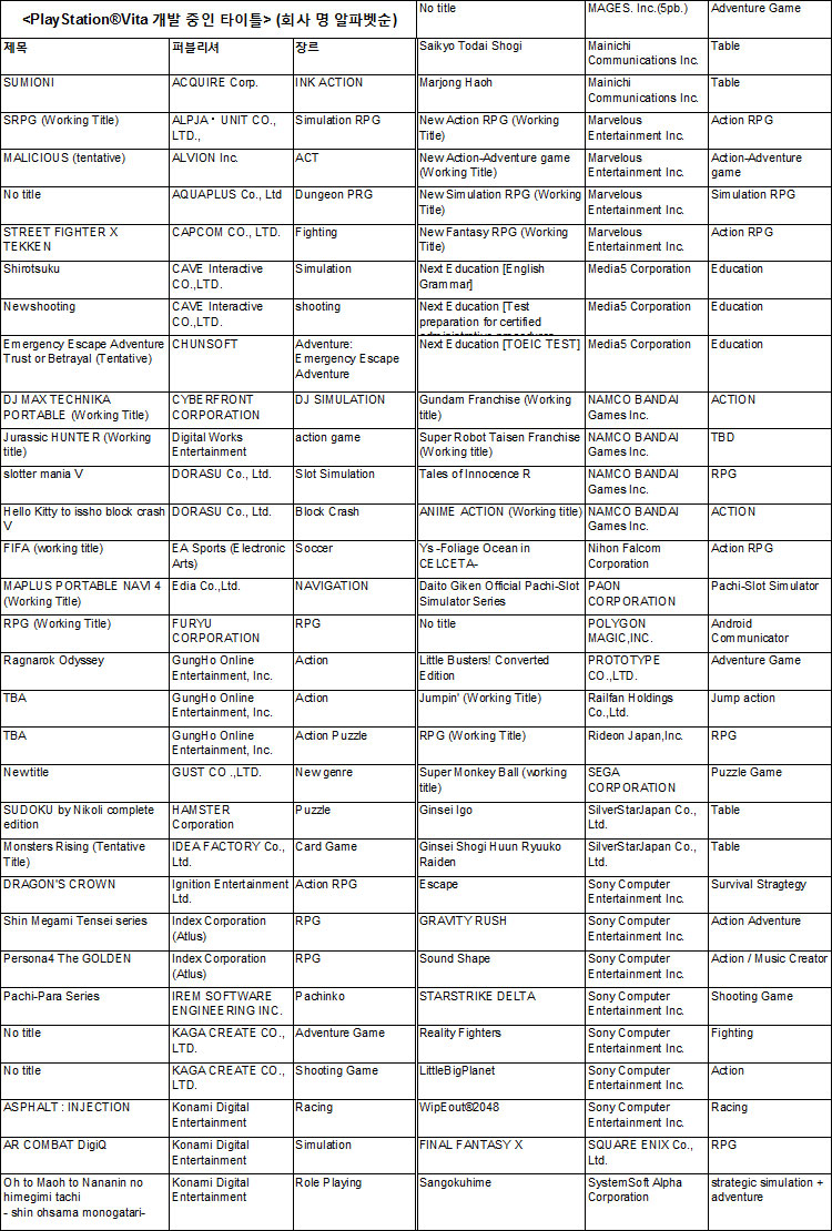 ...(표1) 이중 '니코니코'는 PS Vita에서 Non-Game 어플로 ‘니코니코 동화’ 및 ‘니코니코 생방송’을 이용할 수 있는 전용 어플리케이션이다. ‘니코니코 동화’ 및 ‘니코니코 생방송’은 주식회사 니왕고(본사:도쿄도시부야구, 대표임원:스기모토 세이지(杉本誠司), 이하 니