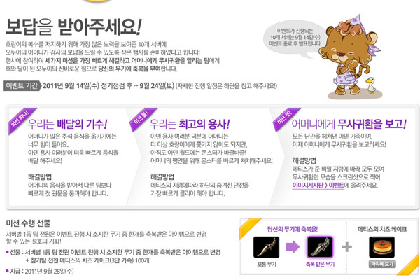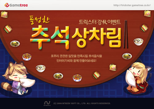 ... 월, 수, 금, 일요일 퀘스트를 완료할 때마다 추석 특별 펫을 받을 수 있는 교환권이 지급되고, 이 교환권이 4개 이상 모이면 'TTX펫'을 받을 수 있다. 또한, 유저가 NPC '깐깐한 포푸리'를 만나 완성된 추석 음식을 검사 받으면 '추석음식 도시락'을 받게 된다. 이