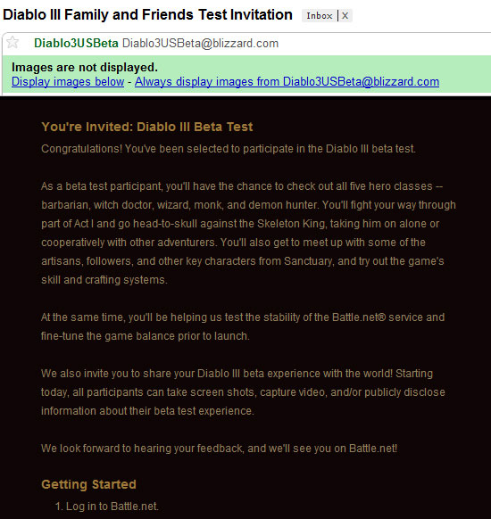 ... 공개된 이메일의 내용에 따르면 야만용사, 악마사냥꾼, 마법사, 수도사, 부두술사 등 5종의 직업을 모두 체험해 볼 수 있으며 액트1에 해당하는 해골왕 콘텐츠까지 모험을 즐길 수 있다. 또한, 게임 내 시스템 중 기술 수련과 공예 시스템을 이용할 수 있다. 특이한 점은 지금
