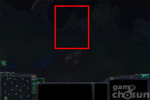 ... ▲화면이 어두워 구분이 쉽지 않지만, 저그가 위치한 곳의 나무는 미세하게흔들린다 물론 정찰되지 않은 지역이어서 화면이 어둡고 나무가 굉장히 미세하게 흔들리기 때문에 얼핏 봐선 구분이 쉽지 않다. 그러나 마우스 스크롤을 이용해 화면을 확대하면 나무의 움직임을 확인할 수