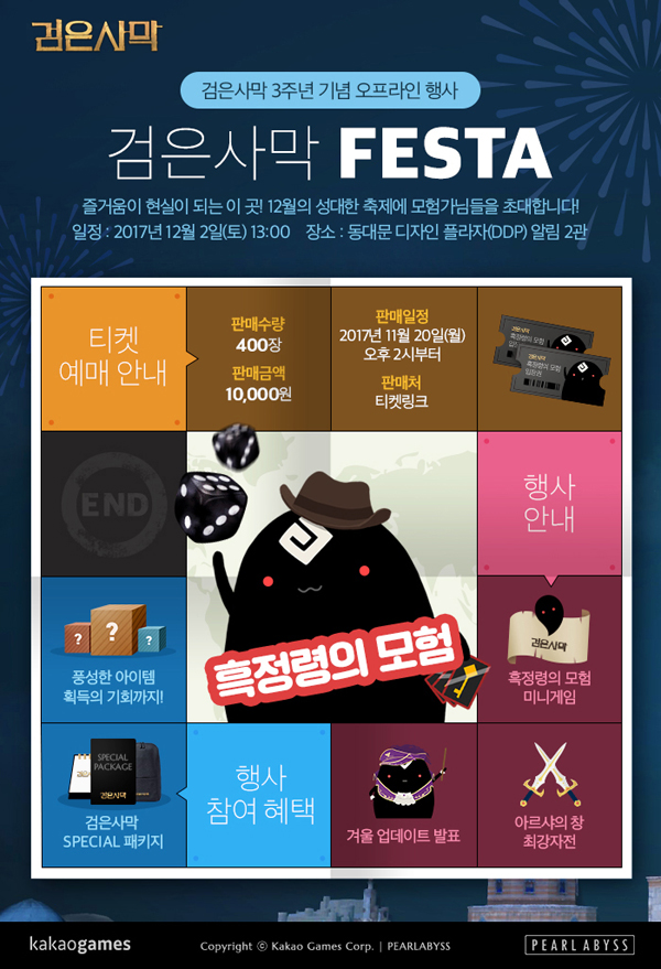 ... 특히, 이용자들의 이목을 사로잡을 만한 대대적인 검은사막 3주년 프로젝트 NEW AGE 계획도 이 자리에서 함께 공개된다. 이 뿐만 아니라, <검은사막>은 행사 참가자들의 즐거움을 한층 더하고자 ‘SPECIAL 패키지’를 특별 제작해 선물할 예정이다.