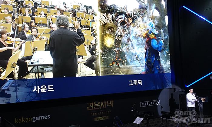 ...검은사막 OST 라이브 = 게임조선 촬영우선 오디오 부문은 벨레노스, 세렌디아, 칼페온에 걸친 총 100여곡의 리마스터링 작업이 진행됐다. 총 300분을 넘기는 오디오 리마스터링은 독일, 체코, 헝가리의 88인조 풀 오케스트라로 레코딩 됐다. 아울러 60여명의 전문 성우 참여로