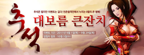 ... 이벤트 기간 동안 홈페이지에 접속해 출석체크를 하면, 참여 일수에 따라 24인치 LCD 모니터, 3만원권 및 1만원권 문화상품권 등을 경품으로 제공한다. 또한 추석 연휴 및 매주 주말에는 정해진 시간에 경험치를 추가로 얻을 수 있으며, 게임에 필요한 유용한 아이템도 증정한다.
