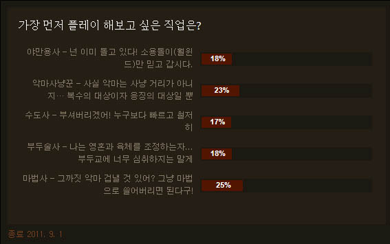 ... ▲ 디아블로3 국내 공식커뮤니티 사이트에서 1일까지 진행된 선호 캐릭터 설문 결과 마법사와 근소한 차이로 2위를 차지한 직업은 아마존과 어쌔신의 특징을 고루 갖춘 악마사냥꾼(23%)로 딱 2%가 아쉽다. 뒤를 이어 부두술사(18%)와 야만용사(18%)로 공동 3위를,
