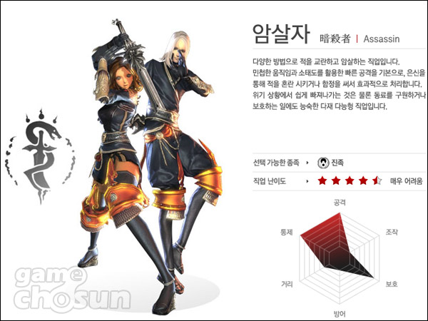 ...이번 블소CBT에서 새로 추가된 암살자도 그동안 여러 매체를 통해 보아왔던 암살자의 모습을 그대로 구현했다. 단검과 길이가 짧은 소태도를 착용하고 민첩한 움직임과 빠른 공격 스타일을 지녔고, 은신을 통한 적의 혼란이나 함정을 사용하는 암살자는 선근, 선골을 지닌 인간 종족으로