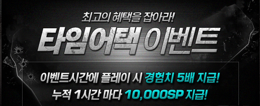 ... 이벤트 시간 : 평일16:00~19:00, 21:00 ~23:00 / 주말12:00~22:00 경험치 획득 : 미션모드 5배, 데스모드 2배 ※ 추가로 게임 플레이 1시간마다 1만 SP 누적,익일17시 일괄 지급. 이번 이벤트는 고속 승진할 수 있는좋은 기회로 5배의