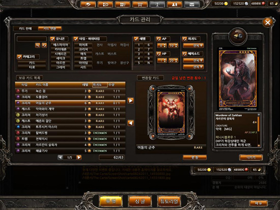 ... 온라인 TCG '카르테'에 카드 변환 시스템이 업데이트 됐다. 카드 변환 시스템은 자신의 보유 카드 중 필요하지 않거나 사용도가 떨어지는 카드를 다른 카드로 변환시켜주는 시스템이다. 레어, 언커먼, 커먼의 희귀도를 가진 카드만 가능하며, 같은 등급, 같은 에피소드의 카드로