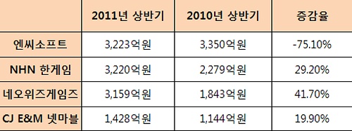 ... 이 같은 순위는 지난해 상반기와 동일하지만, 업체간 격차는 더욱 좁아졌다. 이런 까닭에 각 업체들의 실적 면면을 살펴보면 희비가 엇갈리는 분위기다. 실제로 엔씨소프트는 올 상반기 1위를 수성했음에도 불구하고 매출과 영업이익은 모두 하락세를 걸었다