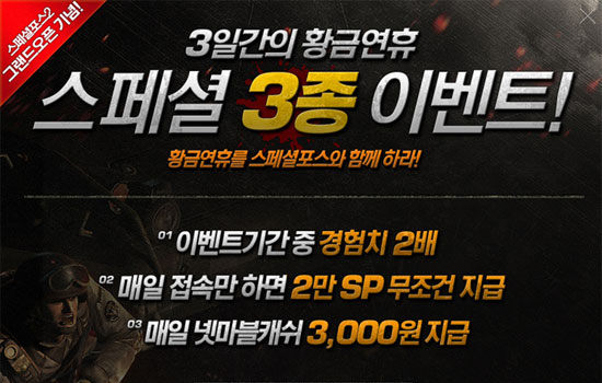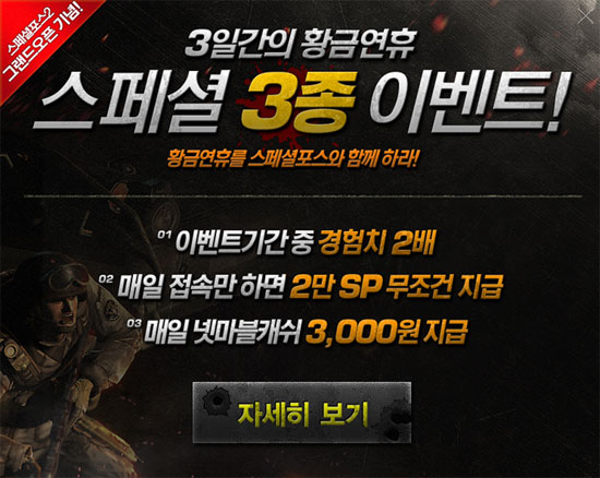 ... 또, 13일 정오부터 15일 자정까지 접속만 하면 매일 2만 SP를 즉시 지급한다. SP는 게임 내 화폐단위로 무기를 구입하거나수리는데 사용된다. 마지막으로 매일 13시~17시, 20시~22시에 게임 플레이 누적시간1시간마다넷마블 캐시 1천원을 지급한다