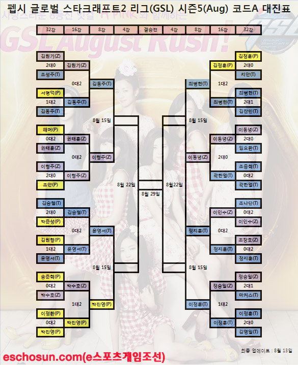 ... 오는 15일 목동 곰TV스튜디오에서 열리는 '펩시 글로벌 스타크래프트2 리그(GSL)2011' 시즌5(Aug) 코드A 8강전 대진표가 확정됐다. 코드A 대회는 8강에 진출하면 상위 리그인 코드S 32강 조 4위와 다음 시즌 GSL 코드S 자격을 두고 승격/강등전(이하 승