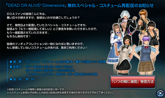 ... 이번에 제공되는 스페셜 코스튬은 총 34종으로 오는 15일부터 9월 17일, 9월 19일부터 12월 22일까지 3DS의 어느새 통신 기능을 이용해 제공될 예정이다. <↑ 게임 홈페이지 내 코스튬 배포 공지> [게임조선 편집국 gamedesk@chosun.