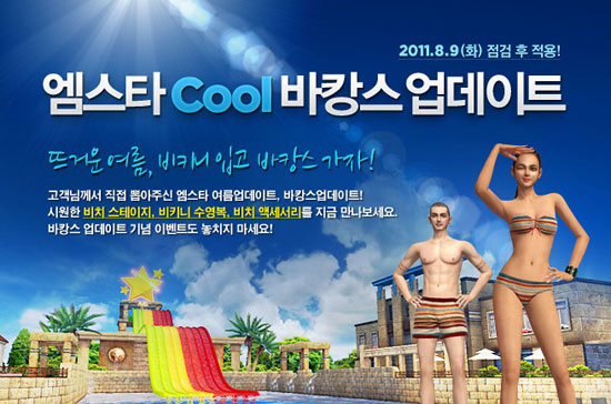 ... 여성 캐릭터의 경우 비키니 상, 하의와 원피스 등 총 3종의 수영복이 추가되며, 남성 캐릭터는 수영복 이외에 남성 전용 문신을 새길 수 있다. 또한, 수영복 아이템을 착용하고 스타오션 리조트에서 게임을 하면 게임 종료 시 캐릭터가 물속으로 뛰어드는 액션을 선보인다. 이번