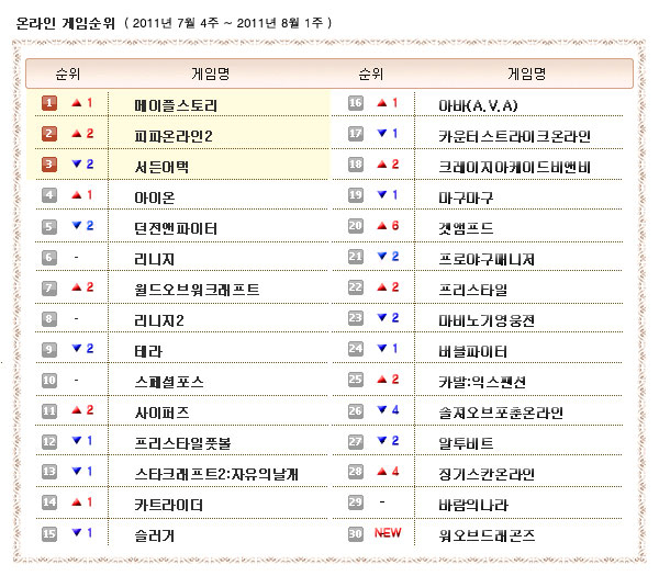 ... 잠시 주춤하는가 싶던 '메이플스토리'와 '피파온라인2'이 다시 상승하며 1, 2위를 탈환했다. 여타 게임들의 여름방학을 맞은 업데이트를 실시하며 맹추격을 시도했지만 여름방학에 들어선 두 게임의 위세는 따라잡지 못했다. 이번 주는 엠게임의 신작 MMORPG '워오브드래곤즈'가