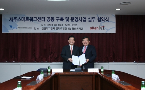 ... 공용회의실 2개와 휴게실, 안내데스크 등도 마련된다. <KT STO추진실 김홍진 부사장(우)과 JDC 변정일 이사장이 3일 제주시 영평동 제주첨단과학기술단지 내 엘리트빌딩에서 제주스마트워크센터 공동 구축 및 운영을 위한 업무협약을 체결하고 기념촬영을 하고 있다. &