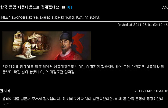 ... 이 유저는 '332 패치 때 업데이트 된 파일에서 세종대왕으로 보이는 이미지가 검출됐다'며 사실을 알렸고, 관리자는 '위 이미지가 패치 때 발견됐다면, 이제 곧 한국 문명이 등장하겠네요'라며 긍정적인 답변을 한 것. 이미 '문명' 시리즈의 개발사인 파이락시스와 국내 유통사