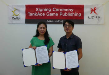 ... <쉬롱(Xu Rong) 구합천하 대표(좌)와 온네트 홍성주 대표가 '탱크에이스' 중국 퍼블리싱 계약을 체결한 후 포즈를 취하고 있다. > 이번 계약에 따라 '탱크에이스'는 구합천하를 통해 3년간 중국에서 서비스되게 된다. '탱크에이스'는 비오비스튜디오가 개