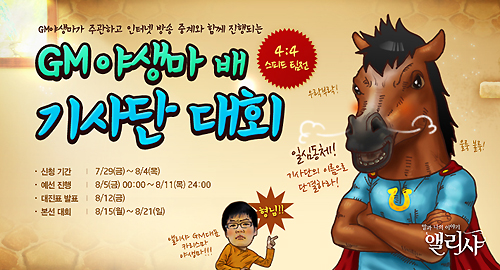 ... 게임 운영자(GM) '야생마'가 주관하는 이번 대회는 스피드 경주로 진행되고 기사단원이 4명 이상인 기사단장(길드장)이면 8월 4일까지 홈페이지를 통해 참가 신청할 수 있다. 예선은 8월 5부터 시작해 7일간 진행되며, 본선과 결선은 8월 15일부터 21일까지 진행된다. 예