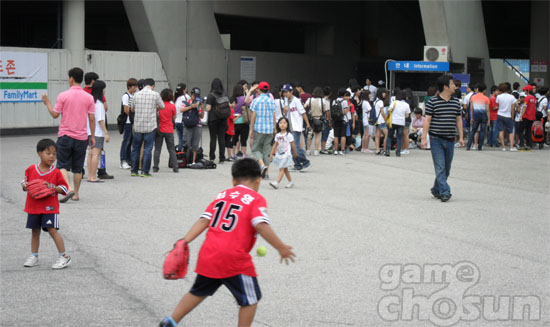 ...23일은주말인데다가 바로 옆에 있는잠실 야구장에서 올스타전이 열리는 날이어서 그런지 종합운동장 근처는 아침부터수많은 야구팬들로 인산인해를 이루고 있었다. <입장을 기다리고 있는많은 야구팬들>한편 주경기장 내부에서는 관람객을 맞이하기 위한 스탭들의 움직임이 분주