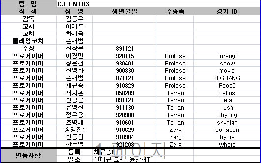 ... 이번 로스터를 살펴보면 CJ는 채규승(P)을 새로 로스터에 등록했고 전태균 코치와 윤찬희(T)를 말소 시켰다. KT는 준PO에서 사용했던 로스터에서 아무런 변동 사항이 없다. 한편, 플레이오프에서 승리한 팀은 오는 8월 6일 상해에서 열리는 결승전에 진출해 SKT1과 격