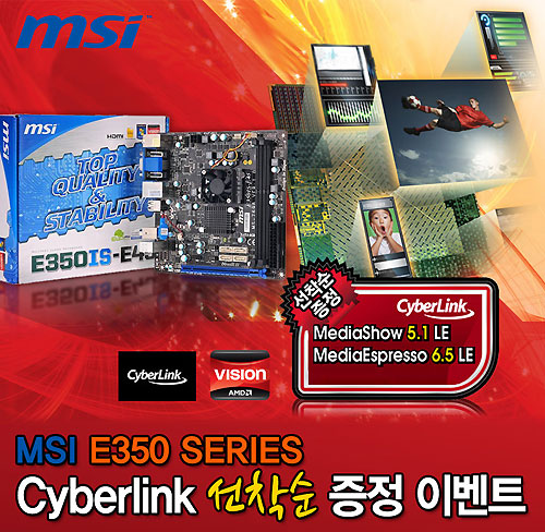 ... MSI E350IA-E45와 E350IS-E45는 AMD APU 가운데 하나인 E-350을 기본 장착한 메인보드다. AMD E-350에는 라데온 그래픽코어가 내장되어 있어 별도의 그래픽카드를 꽂지 않아도 블루레이급 동영상을 재생할 수 있다. 사이버링크 MediaShow