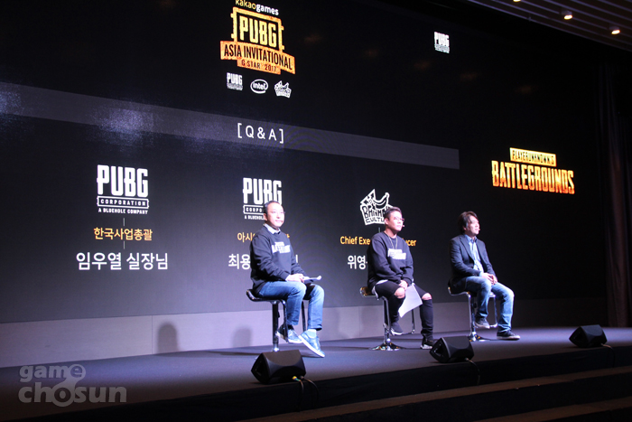 ... 현장에서는 배틀그라운드인비테이셔널에 대한 소개 이후 임우열 펍지 한국사업총괄실장, 최용욱 펍지 아시아사업총괄실장, 위영광 바나나컬처 총괄 PD가 참석해 질의응답시간을 가졌다. - 배틀그라운드 e스포츠를 진행하면서 에임핵 등 게임성을 해치는 경우가 발생하고 있다.