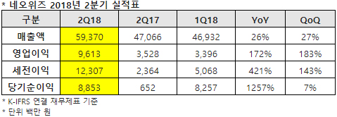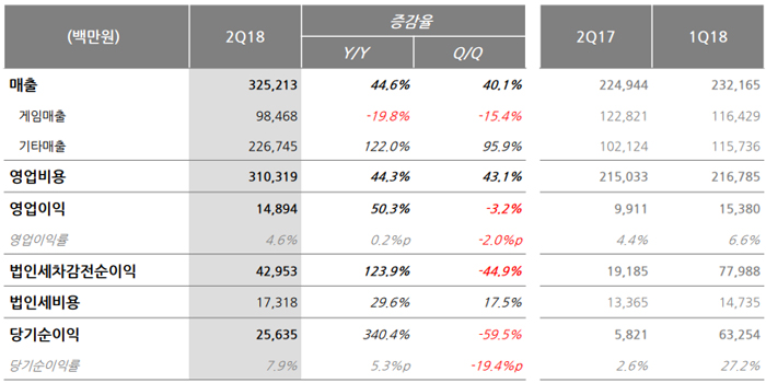 ...3% 상승한 149억원, 당기순이익은 340. 4% 증가한 256억원을 기록했다. 게임 매출의 경우, 웹보드 게임의 계절적 비수기 영향과 일부 게임의 자연 감소로 전 분기 대비 15