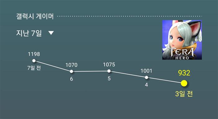 ... 이는 테라 IP로 나온 3개의 게임 중 가장 빠른 속도로 하락한 것. 2019년 9월에 서비스를 시작한 '테라클래식'의 구글플레이스토어 매출 순위가 95위인 것을 감안하면 하락이라기보다 '추락'이라는 표현하는 것이 더 어울리는 수준. 테라히어로