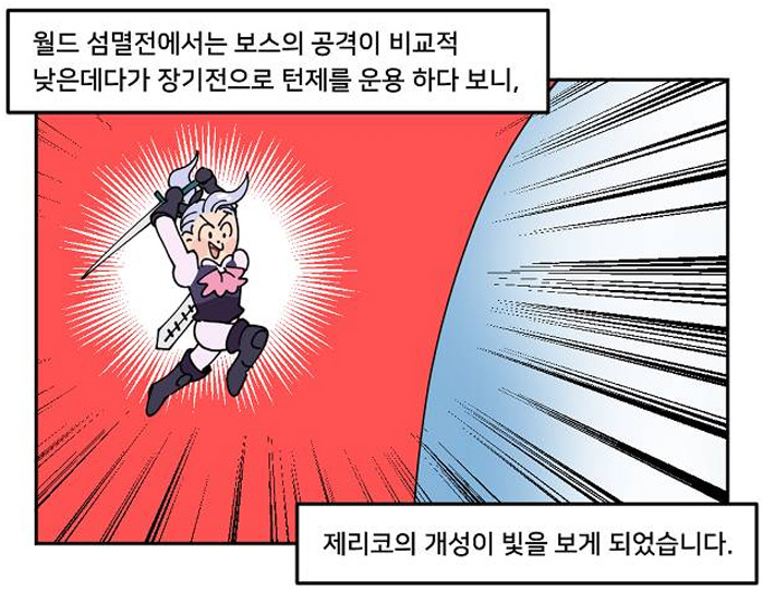 ... 모든 능력 50% 상승 개성이 적용돼 있어 기본적으로 높은 관통과 치명 확률을 가지고 있다. 거의 모든 공격이 치명타로 들어가며 그 대미지도 상당히 높은 편. 덕분에 초보들이 어려움을 겪는 '스토리', '시련의 탑' 등의 어려운 던전에서 톡톡