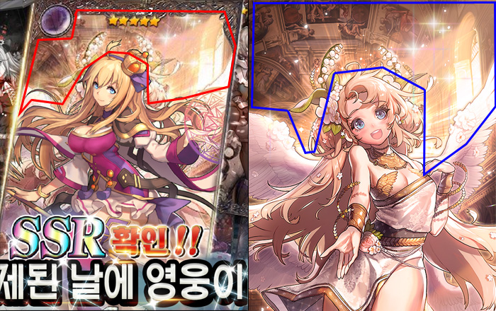 ... 실제 양쪽 이미지의 배경을 비교해보면 창문에서 내려오는 햇살, 날개의 윤곽, 머리 장식 등의 위치가 대부분 일치한다. 이 외에도 배경을 도용한 것으로 보이는 일러스트는 다수 있었다. 대부분 데스티니 차일드의 일러스트를 밑그림으로 깔고 캐릭터를 위에 덧씌운 듯 배경이 동일