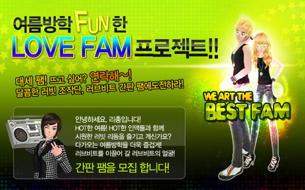 ... 이와 함께게임룸과 로비/마이룸 신곡을 각각 7곡, 신상 패션 아이템을 47개, 액세서리 아이템 4개, 말풍선 아이템 2개를 추가하는 업데이트도 공개했다. 러브비트의 팸은 타 게임의 길드나 클랜과 유사한 개념인 '러브비트'의 팸은 유저들이 모여 활동하는 커뮤니티로 외모, 음