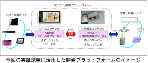 ... <↑ 이번 실험에 대한 개념 설명도> 이번 실험은 웹으로 연동된 가정 내 TV나 에어콘 등의 가전기기가 소니에서 개발한 카데코라는 게임 개발툴과 다이와가 개발한 주택API를 통해 친근한 애니메이션 캐릭터로 스마트폰에 표현되는 것. 특히, 각 기기의 특징이