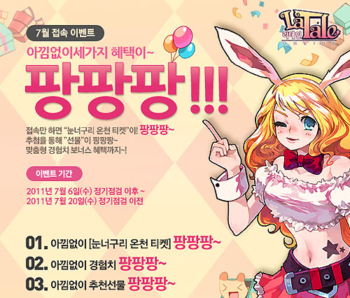 ... 우선, 이벤트 기간 동안 '라테일'에 접속하는 모든 고객에게 기간제 이벤트 눈 너구리 온천 티켓을 제공한다. 눈 너구리 온천 티켓은 온천에 입장만 해도 경험치의 혜택을 얻을 수 있는 특별 아이템으로, NPC토마에게서 교환할 수 있다. 또한 눈 너구리 온천 티켓을 사용한 고객