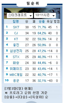 ... 반면,공군 팀에 패배하면 6위로 내려앉고 3위인 KT와 맞붙게 된다. (우측 팀 순위표 참조, 출처: 한국e스포츠협회) 현재 팀 순위 1위부터 5위를 차지한SKT와 CJ, KT, 웅진, STX의 경기가 모두 끝났기 때문에 이러한 경우의 수가 가능한 상황이다. 따라서 삼성