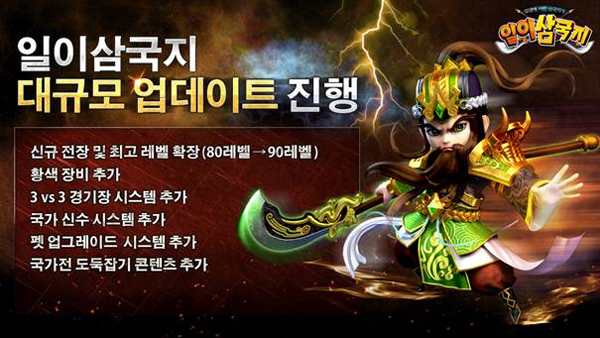 ... 일이삼국지는 이번 대규모 업데이트를 통해 신규 전장을 확장하고 기존 최고레벨을 80레벨에서 90레벨로 상향 조정했다. 특히 유저간 대결을 즐길 수 있는 3vs3 경기장 시스템과 게임 내 핵심 콘텐츠로 손꼽히는 국가전내 도둑잡기 시스템이 새롭게 추가됐다. 또한 단체 펫 육성