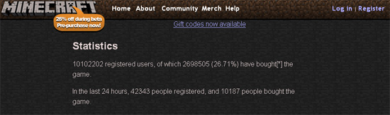 ... 4일 현재 1000만명 이상이 게임에 가입하고 약 270만명의 유저가 게임을 구매했으며 지난 24시간동안 약 4만명의 유저가 가입하고 1만명의 유저가 게임을 구매했다. <↑ 마인크래프트 공식 홈페이지> 한편, 자유도 높은 샌드박스형 게임으로 인기를 얻고