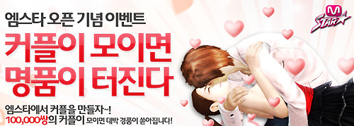 ... 먼저 게임 내 남녀 이용자들이 커플을 맺어 누적된 커플 수가 10만 쌍에 도달하면 추첨을 통해 루이비통 토드백, 프라다 여성지갑 등 명품 선물과 아이패드2, 넷마블 캐쉬 등 경품을 제공한다. '엠스타'를 즐기는 이용자라면 누구나 참여 가능하며, 캐릭터 생성 후 마음에 드는 이성