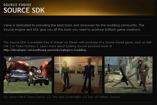 ...밸브는 소스엔진 개발킷(이하 소스SDK)과 모드 툴을 무료로 배포한다. 소스SDK 및 모드 툴은 '하프라이프2' 및 '팀포트리스2' 등 소스엔진을 활용해 제작된 게임의 이용자를 대상으로 스팀 서비스를 통해 무료로 제공된다. 게이머는 소스SDK를 활용해 기존 모드 게임을 변
