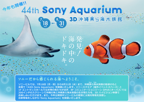 ...소니는 오키나와 츄라우미 수족관의 감수 아래, 도쿄 긴자에 위치한 소니 빌딩에서 개최되는 소니 아쿠아리움 및 PS홈 연동 기획을 밝혔다. 이 회사는 오는 18일부터 8월 31일까지 긴자 소니빌딩에 대형 수조를 마련하는 것은 물론 수족관의 모습을 담은 영상을 고화질 3D화면