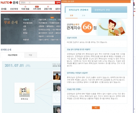 ... 이번 베타서비스에서는 베스트와 워스트 동료 등을 알려주는 직장편이 무료로 제공된다. 또 관계 요약, 업무 관련, 업무 외 관련, 조언 그리고 나의 관점과 상대방의 관점으로 시점을 달리해 알아볼 수 있어 재미를 더했다. 100점 만점으로 환산되어 나타나는 관계지수도 오
