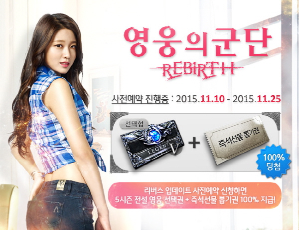 ... 또 유저들이 SNS에 이벤트를 공유할 때마다 '7시즌 전설 티켓(선택형)' 등 즉석 선물 아이템을 추가 증정한다. 한편, 넥슨은 '리버스' 업데이트 홍보 모델로 인기 걸그룹 'AOA'를 발탁하고 광고 영상을 최초로 공개했다. 'AOA'는 '영웅의군단'의 광고뿐 아니라 게임 내에