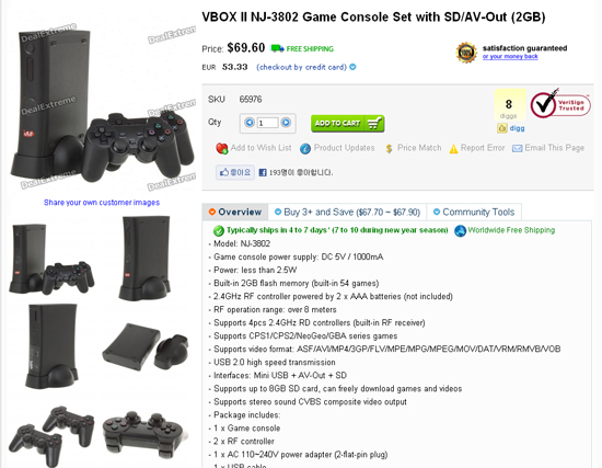 ... 본체는 신형 Xbox360이, 컨트롤러는 PS3용 컨트롤러가 떠오른다. 하지만이 게임기는 Xbox360용 게임이나 PS3게임을 실행하지는 못한다. 불법 공유로 업계의 고민 거리 중 하나인 캡콤의 과거아케이드 기판, 네오지오, 게임보이어드밴스용 롬파일을 실행하는 에뮬레이터