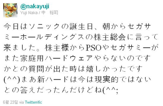...세가의 대표 캐릭터인 소닉의 창시자인 나카 유지가 자신의 트위터를 통해 세가의 차세대 게임과 관련해 부정한 사실을 공개했다. 그는 지난 23일 "오늘은 소닉의 탄생일, 아침부터 세가사미홀딩스의 주주총회에서 말을 들었다"며 글을 시작했다. 그가 들은 말은 다름아닌 판타지스