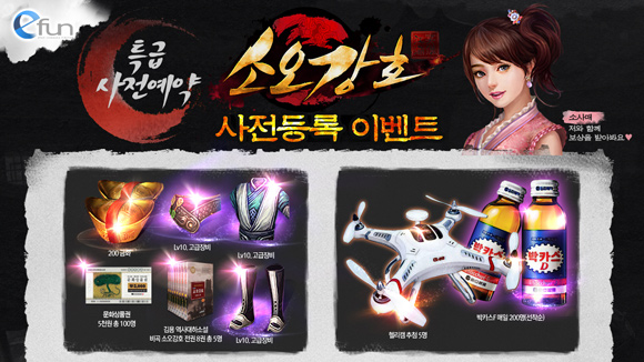 ... 회사 측은 사전예약을 기념해 이벤트 참여자 전원에게 고급장비 3종 패키지와 200금화를 100% 증정하고, 게임 메인 캐릭터 동영상을 감상한 후, 가장 마음에 드는 캐릭터 한 명을 선택하면 추첨을 통해 문화상품권 5천원권(100명)과 김용 역사 대하소설 비곡 소오강호 전권(5명)