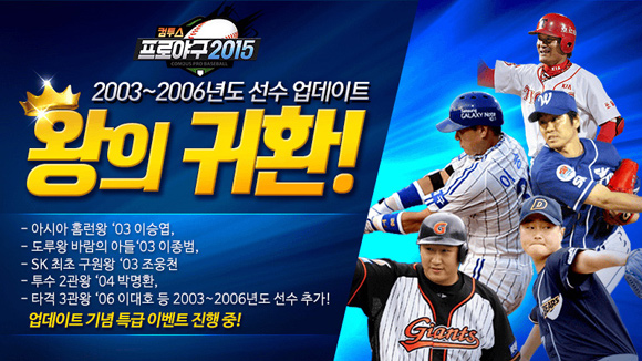 ... 이를 기념해 컴투스는 8월 16일까지 오후 6시 30분부터 자정 내 게임에 접속하는 모든 유저에게 ‘2003-2006 고급 선수팩’ 1장씩을 매일 선물하고, 19일 자정까지 게임 내 상점에서 ‘2003-2006 선수팩’을 한시적으로 판매한다. 랜덤 선수영입 ‘FA’시스템에는 1