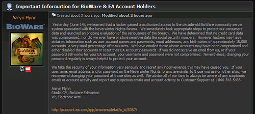 ...최근 해킹관련 소식이 끊이지 않고 있는 가운데 바이오웨어의 인터넷포럼 서버가 해킹당해 약 18000 여명의 개인정보가 유출된 것으로 밝혀졌다. 바이오웨어 에드먼턴 스튜디오 GM이며, 일렉트로닉아츠(이하 EA)의 부사장인 아린 플린은 바이오웨어 포럼에 해킹공격에 대한 내용을 공지