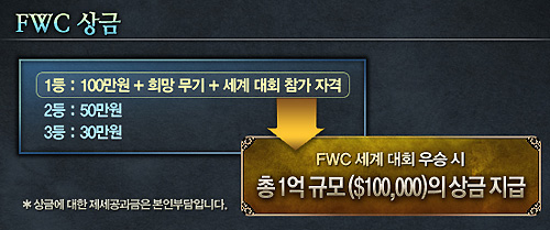 ... 올해 제 1회를 맞는 FWC에는 국가별 예선을 거쳐 16개 팀이 참여하며, 총 상금 규모가 10만 달러(약 1억원)으로 게이머들의 관심을 끌 예정이다. 참가자격은 15레벨 이상의 캐릭터를 보유한 게이머라면 누구든지 가능하며, 한 팀당 8명씩 각각 원하는 직업으로 구성해 신