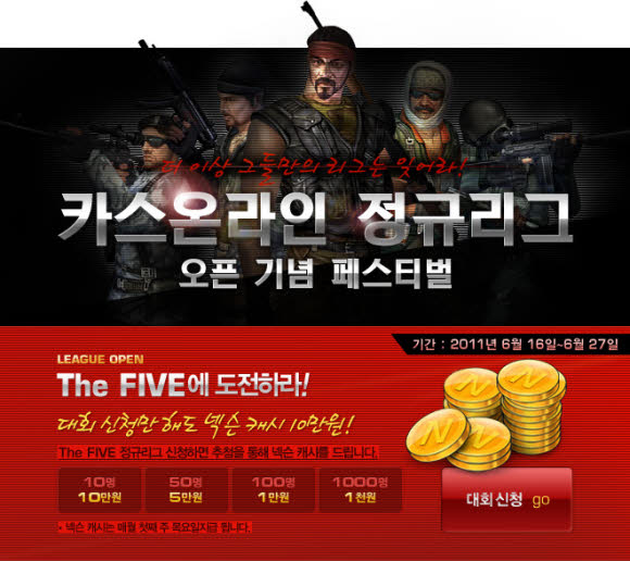 ... ‘카스 온라인’을 즐기는 모든 아마추어 개인 유저들의 리그 참여가 가능하며 대회성격에 맞게 서바이벌 형식의 개인 데스매치 모드도 열린다. 더파이브 대회 참가자들은 내달 3일 오프라인 예선을 통해 본선진출 자격을 획득할 수 있다. 본선에 진출한 25명은 5개의 그