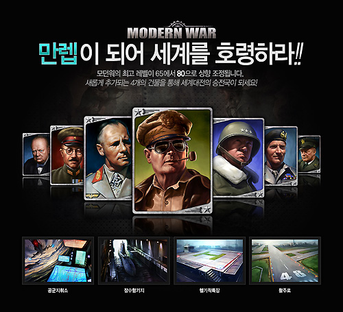 ... 신병훈련소 건물 업그레이드 최고 수치가 45레벨에서 49레벨로 확장 되었고, 그 외 건물의 경우는 업그레이드 동맹 수를 충족 할 경우 최고 50레벨까지 업그레이드가 가능하다. 이와 함께 신규 건물로 헬기착륙장, 활주로, 공군지휘소, 잠수함기지 등이 추가 되었으며 추후에 인물카