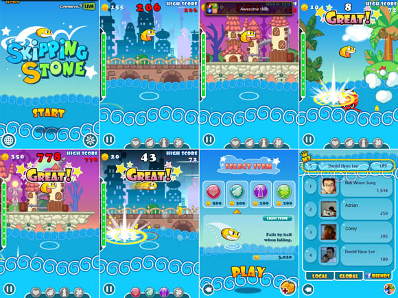 ... 이 게임은 휴대폰의 특성을 위트있게 활용, 국내외 시장에서 사랑을 받았던 원버튼 모바일게임 ‘물가에돌튕기기’의 리메이크 작이다. '스키핑스톤'은 스마트폰에 최적화 된 애플 앱스토어용 게임으로 게임빌 최초 유니티3D 엔진을 기반으로 해 조약돌의 상하방향 튕김, 물결치는 파도