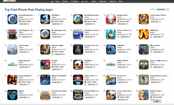 ... ↑ 애플 앱스토어 RPG장르 1~3위가 모두 게임빌 게임(13일 기준) 특히 최근 출시한 ‘베이스볼 슈퍼스타즈2’와 ‘제노니아3’ ‘베이스볼 슈퍼스타즈2011’은 미국 애플 앱스토어의 다운로드 기준으로 집계된 RPG 인기 차트에서 1위부터 3위를 석권했다. 동일 장르에서